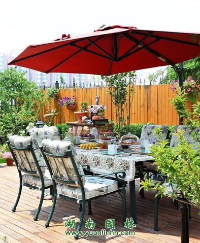 綠色的鐵藝桌椅,與紅色的戶(hù)外遮陽(yáng)傘垂直綠化交相輝映,桌上擺滿(mǎn)各式美食美酒,周末約上好友,搞個(gè)Party,在歡樂(lè)的氣氛中高呼“友誼萬(wàn)萬(wàn)歲”。