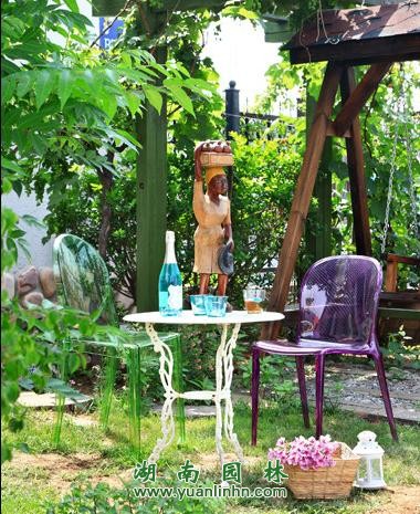 地質(zhì)臺(tái)板和椿樹(shù)分割開(kāi)了整個(gè)花園的每個(gè)功能區(qū)域。兔毛兒爸爸從世界各國(guó)淘買(mǎi)回來(lái)的工藝品點(diǎn)綴在植物叢中,充滿(mǎn)了異國(guó)氣息。