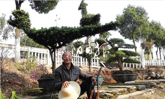 最高一株樹木有兩三人高,樹干集中在一起被修剪成一只山羊的別墅景觀形狀,有意思的是,山羊的腳下還“踩著”幾叢樹枝,似乎剛吃完草抬起頭的樣子。“羊要吃草,腳下有綠意才能代表心想事成。”60歲的李榮佳解釋他的作品,說樹木的生長(zhǎng)有它們自己的“想法”,這棵樹已經(jīng)有姿態(tài)了,他只是在其生長(zhǎng)的基礎(chǔ)上“再加工”。