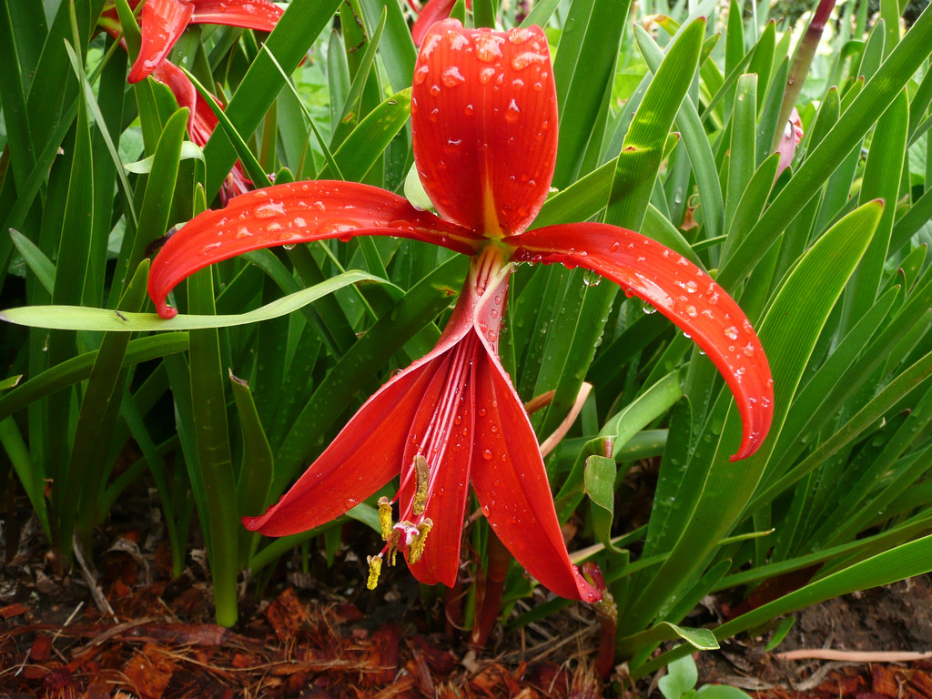 形態(tài)特征:株高室內(nèi)裝飾30cm,具被膜鱗莖。葉條形,與花蕾同長。花單生空心花葶頂端,花葶高45cm?;ü谏罴t色,筒部短,上部裂片3枚,分開,直立而狹,外翻。下部三枚裂片靠攏,其下部卷攏呈筒狀?;ü趦A斜,形成明顯的二唇狀,花徑10cm?;ńz鮮紅色?;ㄆ谕泶夯虺跸摹2荒秃?,喜溫暖向陽環(huán)境,一般作溫室植物,栽培介質(zhì)需富含纖維質(zhì)的肥沃壤土。冬季葉子轉(zhuǎn)黃后,盆土不澆水。至翌苗木綠發(fā)年發(fā)葉抽葶時(shí)給水。每3-4年翻盆一次。繁殖培育:分球或播種繁殖。如栽培得宜,一年中可5次開花。園林用途:用作溫室盆花,或暖地地栽。