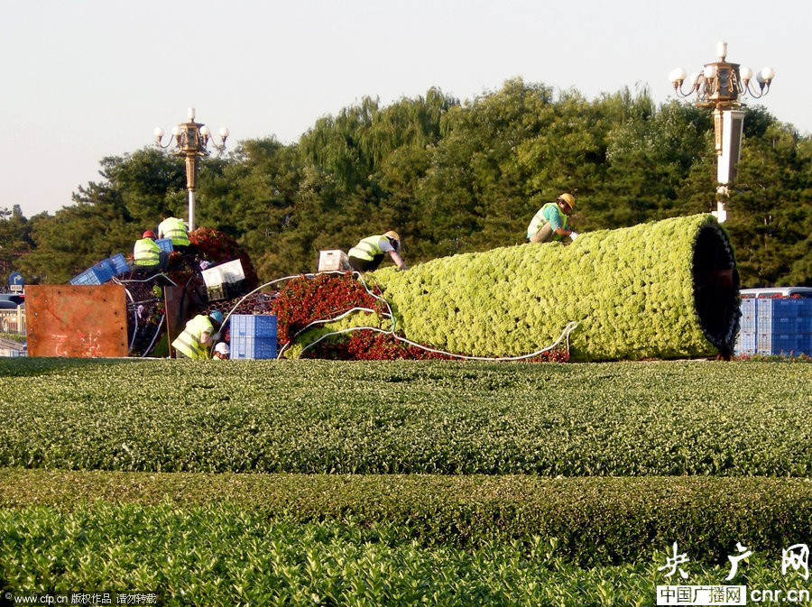 2014年08月26日,北京天安門廣場東、西側(cè)綠地,園林工人開始更新立智慧花園體花柱上的花卉,迎接國慶65周年的到室內(nèi)裝飾來。