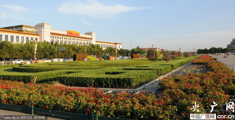 2014年08月26日,北京天安門廣場東、西側(cè)綠地,園林工人開始更新立智慧花園體花柱上的花卉,迎接國慶65周年的到室內(nèi)裝飾來。 " />