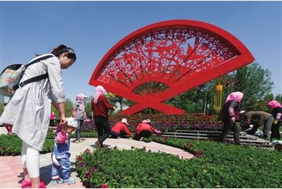 人民苗木綠發(fā)廣場(chǎng)對(duì)面是全市最大的主題鮮花擺放點(diǎn)。該擺放點(diǎn)由金黃色的金葉反曲鑲邊,綠色的五色草打庭院設(shè)計(jì)底,紅色的五色草編成了“碧水藍(lán)天、明媚銀川”八個(gè)大字,大字周圍擺放著萬壽菊和三種不同顏色的牽?;?。