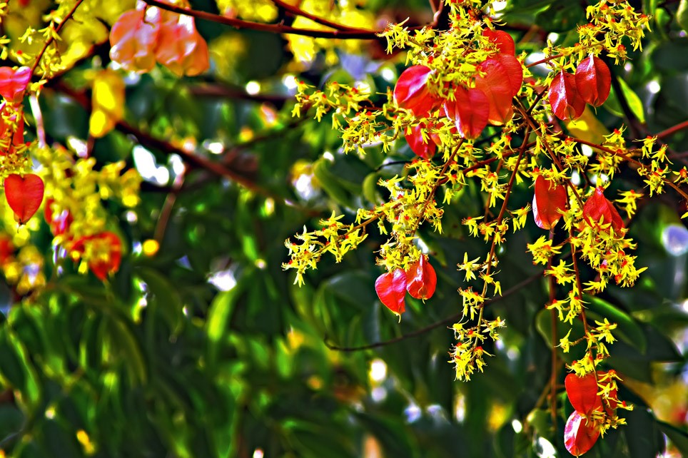不知道大家有沒有跟我一樣的經(jīng)歷,打街頭走過,看到一排排秀麗的大樹,普通得如所有不知名的大樹一般,并沒有讓人驚鴻一瞥,可是到了九月里,卻發(fā)現(xiàn)那些高大的樹已經(jīng)在不經(jīng)意間綻放了滿枝豐盈的色彩。秋高氣爽的藍(lán)天白云,映襯著欒樹枝頭綻滿的小燈籠,金黃的、嫩青的、最美的還是成熟了的那串串緋紅如霞的果莢。再次抬頭仰望它的時候,一種愉悅油然而生,讓人忍不住想要擁抱這美好的秋光。