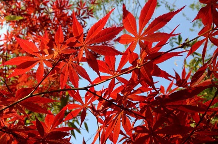 雞爪槭葉一般也是5-9片葉片組成,但是7片居多,無(wú)毛,葉片間開(kāi)裂深度較淺,一般不超過(guò)1/3。葉色在出夏季為綠色,秋季才變紅,冬季凋零。