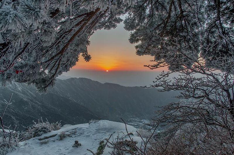如果是在12月初上南岳賞景的朋友還能欣賞到一山呈現(xiàn)秋冬兩季的美景,半山腰一下楓葉艷紅,杏樹金黃,而海拔較高的山頂則冰雪縹緲,宛如仙境。