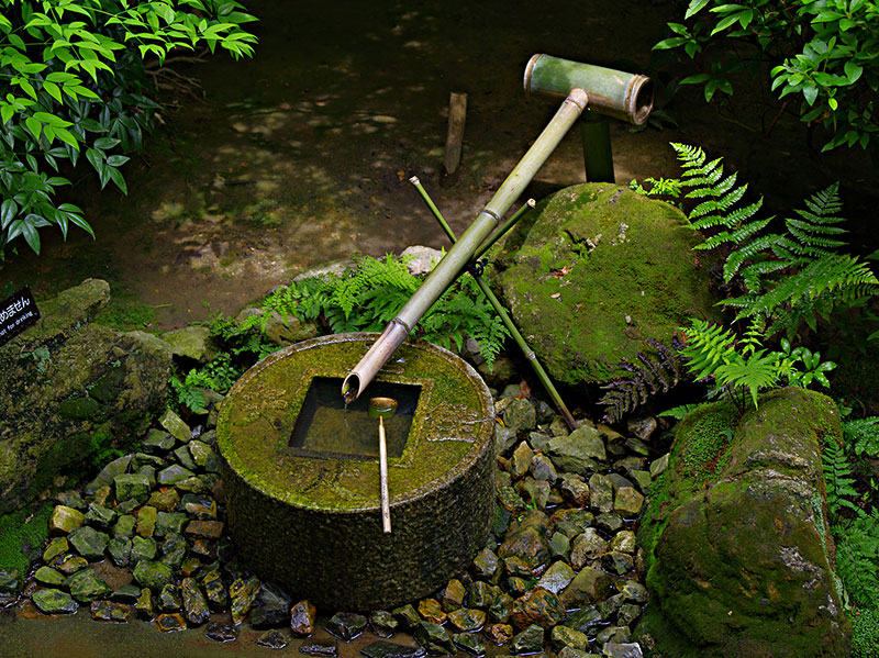 驚鹿,也叫鹿威,逐鹿,添水,僧都,驚鳥器。主要是通過杠桿原理,利用儲存一定量的流水使竹筒的平衡發(fā)生改變,然后使竹筒的一端敲擊時缽,發(fā)出響聲,起到驚鳥的作用。