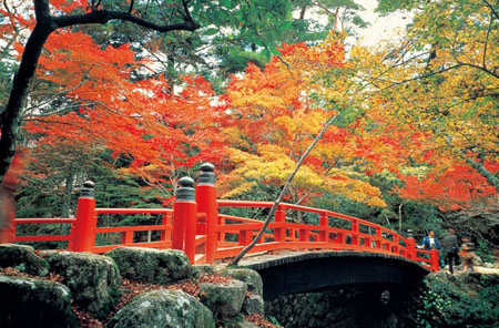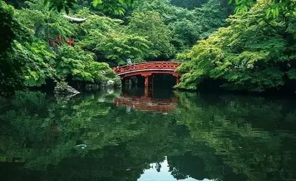 在有橋的日式庭院中,橋的顏色大多為紅色。橋在日式庭院中充滿著禪意,象征著此岸與彼岸的連接。冬季的雪后,紅橋與白雪相映襯,別有一番滋味。