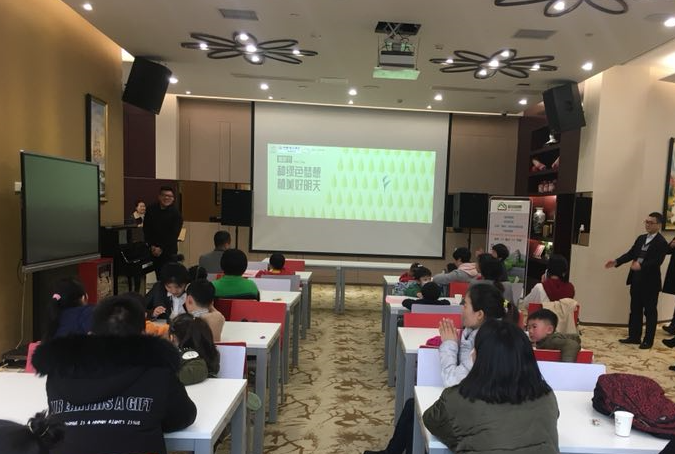 活動(dòng)休息期間,家長(zhǎng)帶領(lǐng)小孩參觀由寓安園林設(shè)計(jì)制作的華融湘江銀行至尊VIP室“三山一水”室內(nèi)景觀。