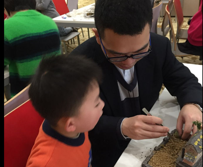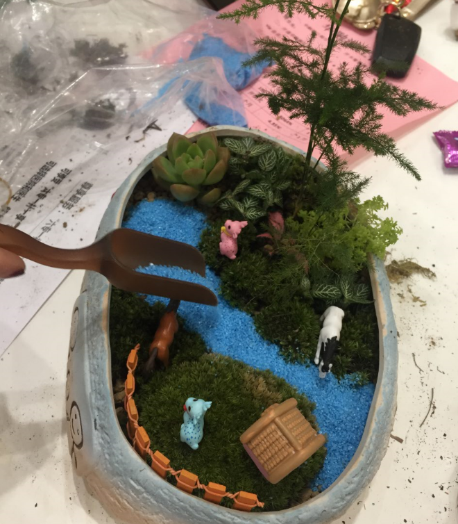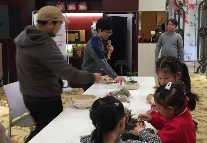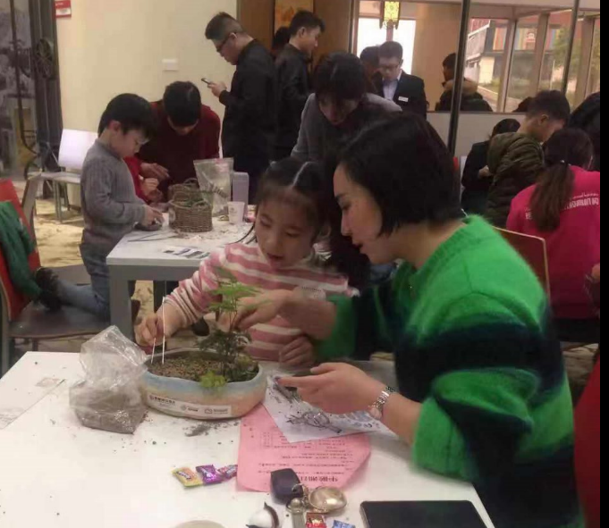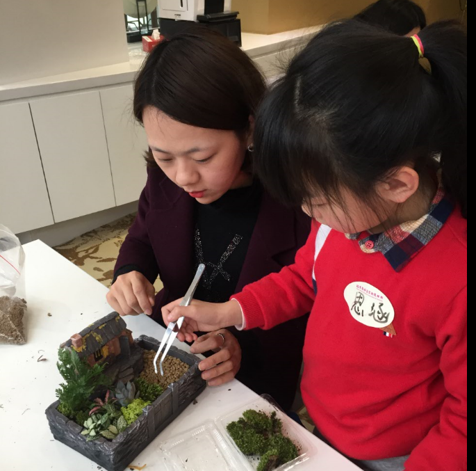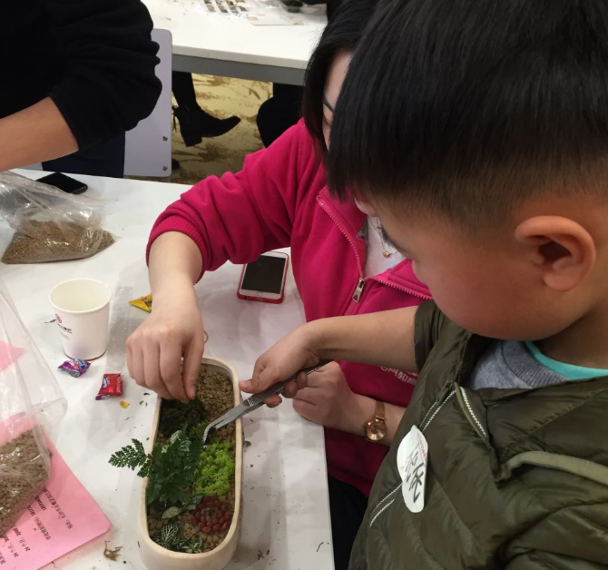 經(jīng)過(guò)寓安園林工作人員的現(xiàn)場(chǎng)講解和演示后,家長(zhǎng)跟小朋友互相配合,開(kāi)始了自己的微景觀設(shè)計(jì)。