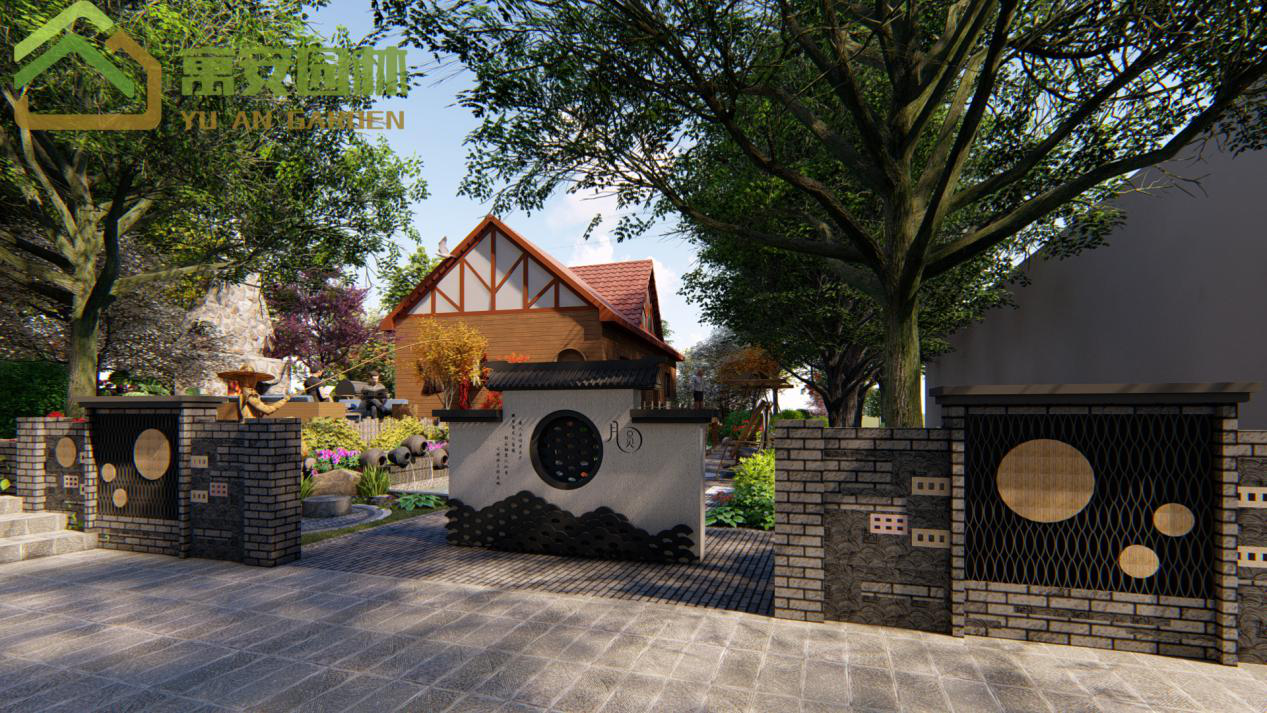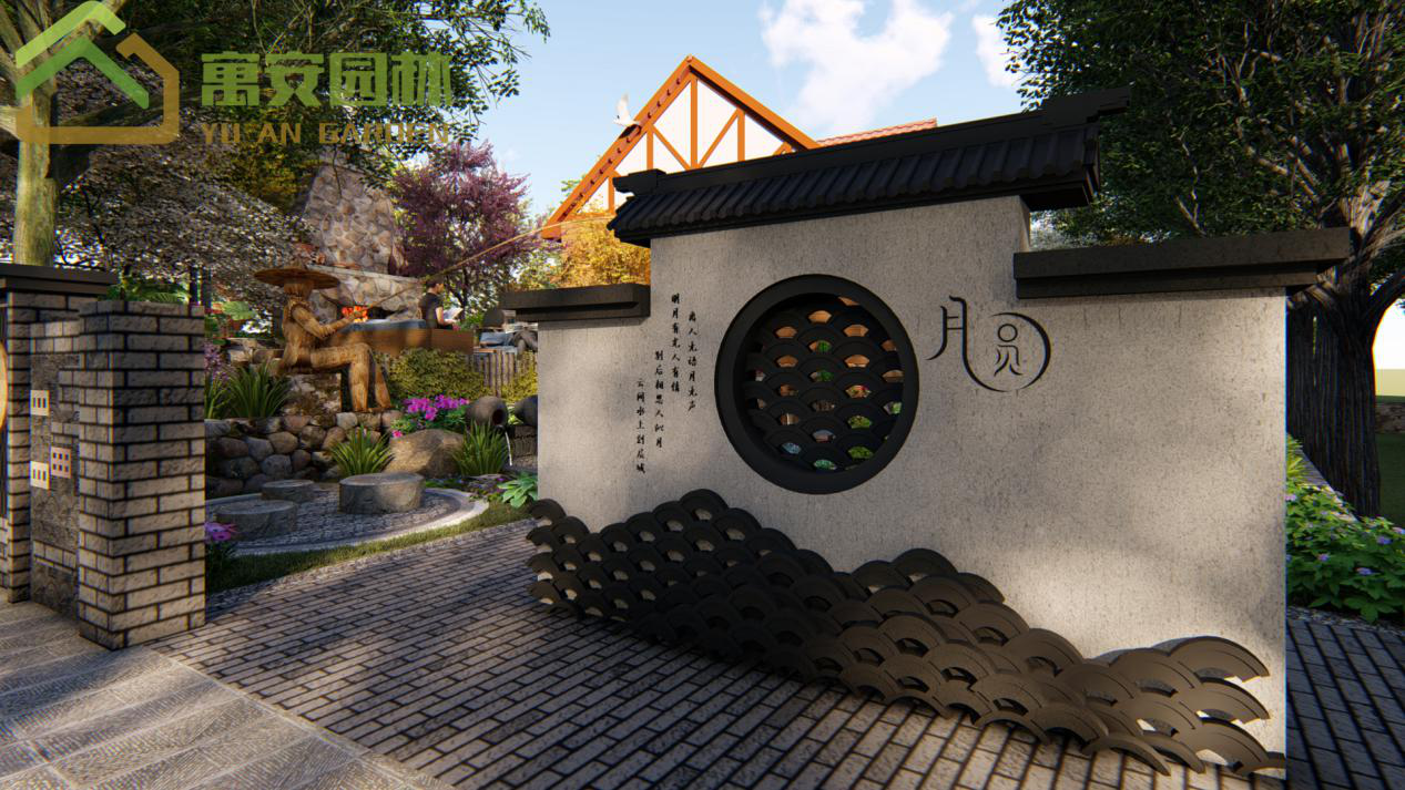這次相思谷景觀設(shè)計(jì)以月為元素,用中式自然風(fēng)格的造園手法,入口以照壁景墻作擋景作用,讓人不能一眼望盡,添加了神秘色彩,而景墻上開了一個(gè)圓月形的窗作漏景作用,中間用瓦片填充,漏一些里面的景色,讓人忍不住想進(jìn)去一探究竟。