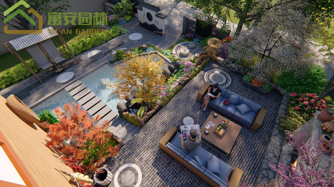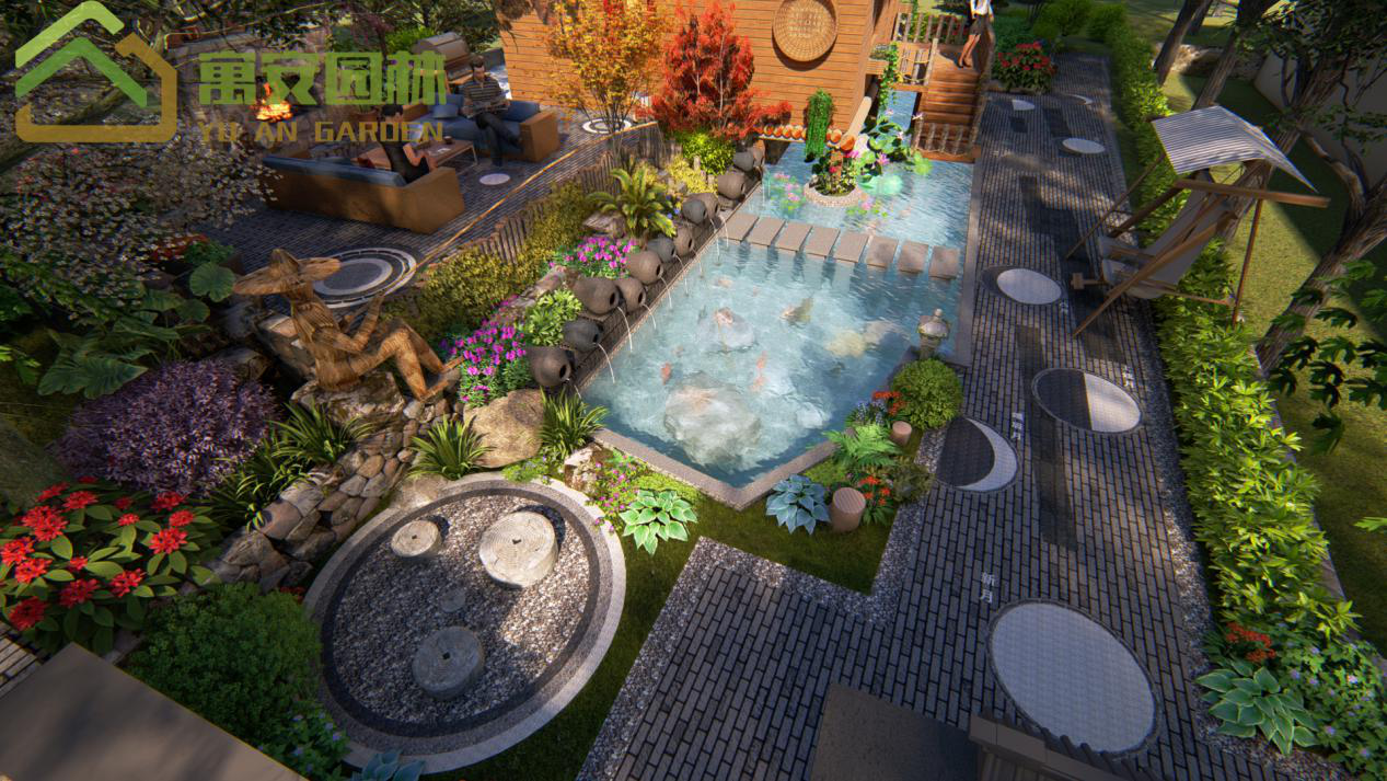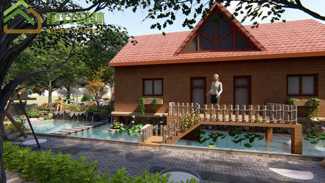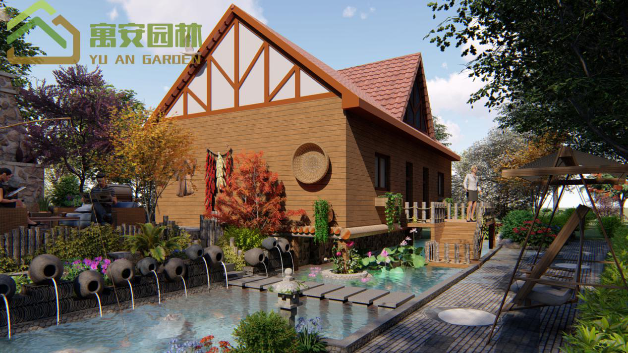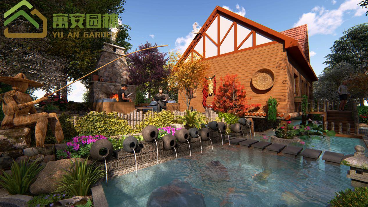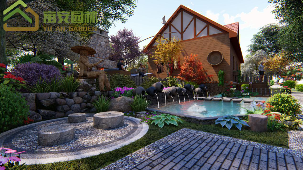 這里我添加了許多田園風(fēng)的小景,矮墻用自然的石頭堆積,并設(shè)計(jì)了稻草人在江邊釣魚的特色風(fēng)景。水景我們用特色的壇子作噴水景,水池中有汀步可以通過到另外一個(gè)平臺休憩并賞這個(gè)潺潺流水的水景。鋪裝上我們也添加了田園風(fēng)元素,收邊采用的鵝卵石收邊,還添加了特色石磨,石磨還可以坐下休息。進(jìn)入房子的小木橋樓梯的扶手我用木頭樁繞木繩的樣式。讓風(fēng)景充滿自然田園色彩。