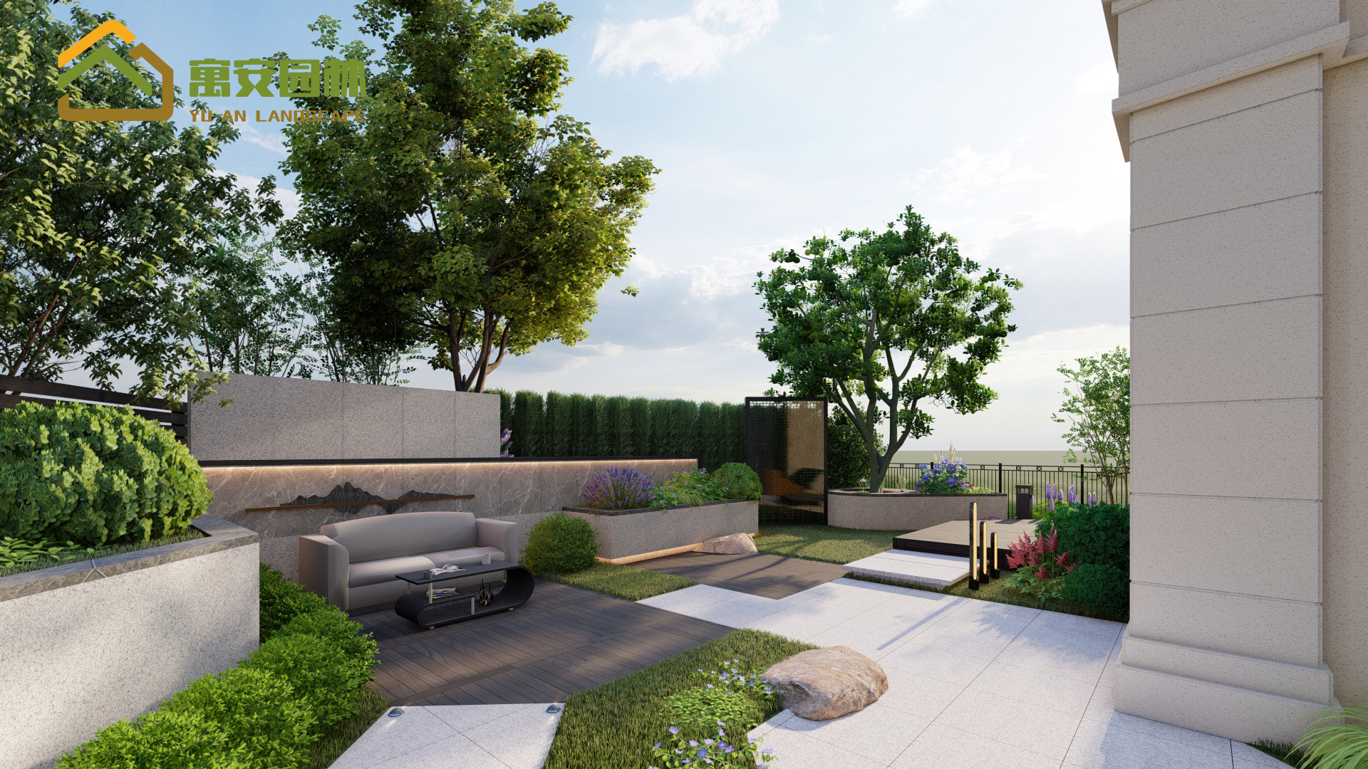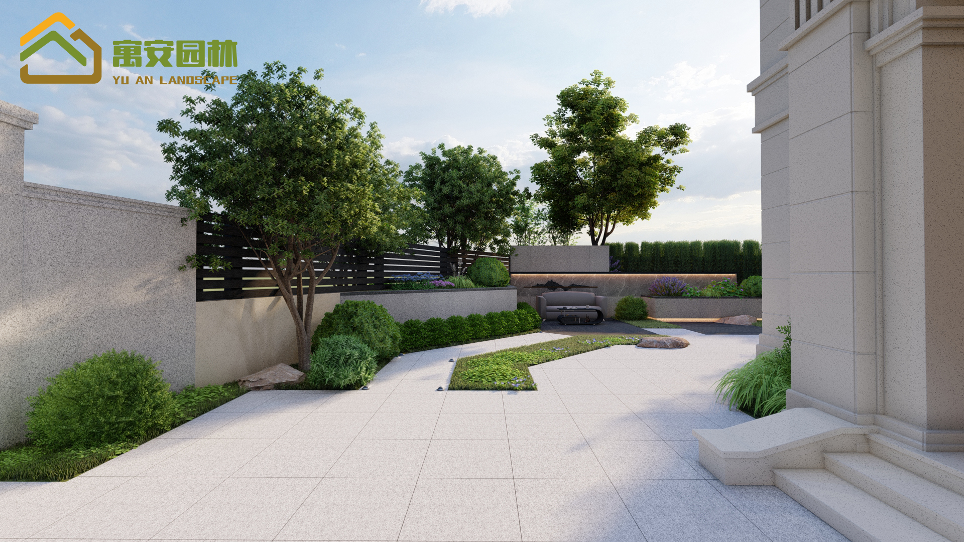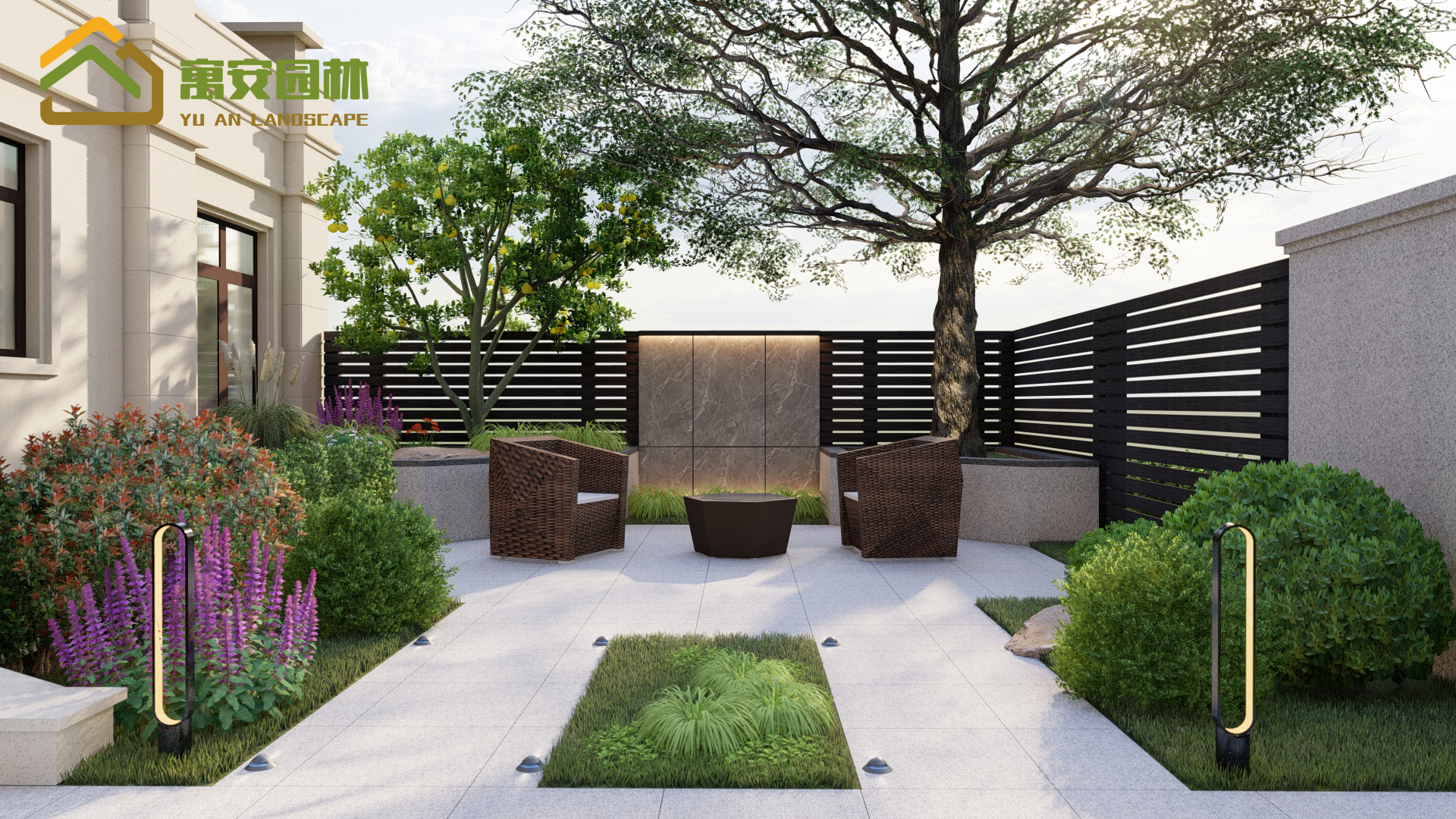 應(yīng)業(yè)主要求,干凈整潔,便于打掃衛(wèi)生,所以院內(nèi)植物都是種植便于打理的植物為主,鋪裝面積大于綠化面積,以鋪裝為主,