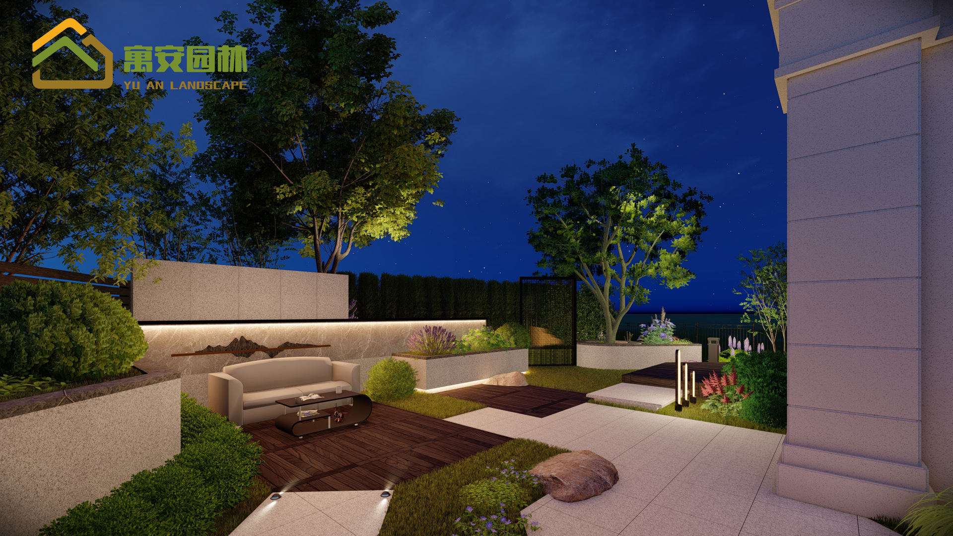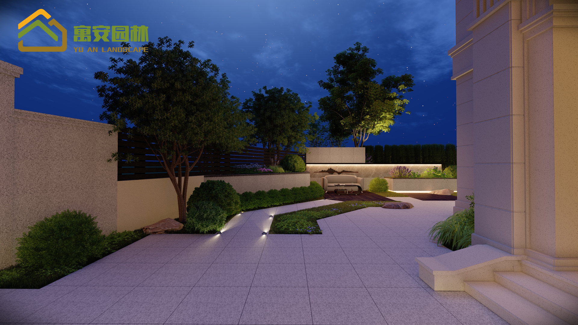 夜景燈光以溫馨整個(gè)花園為目的,暖色調(diào)的燈光更能讓人感受的家的溫暖。