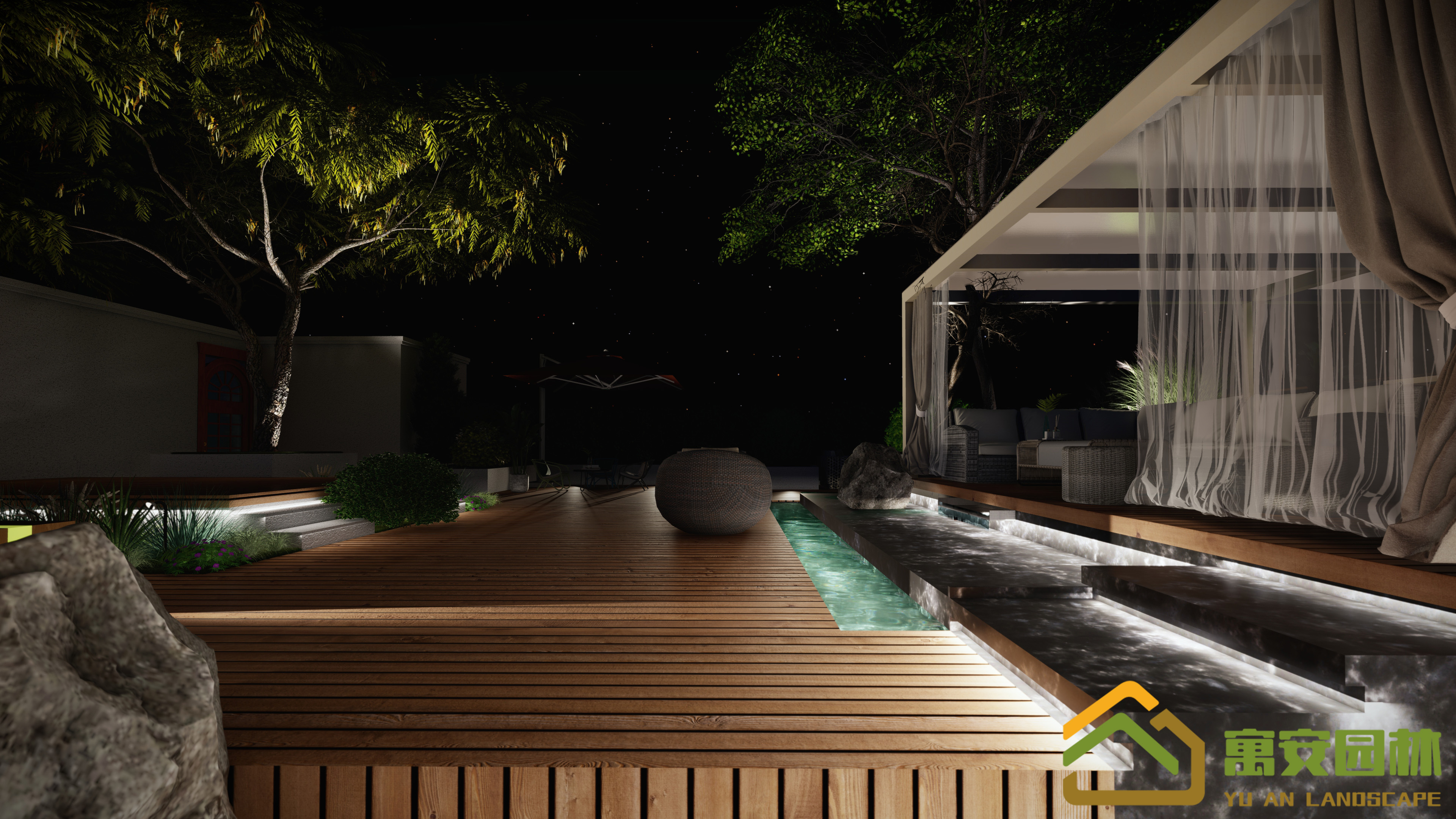 客在晚上觀賞涓涓細流,在休憩的同時聽見潺潺細流,好不愜意。