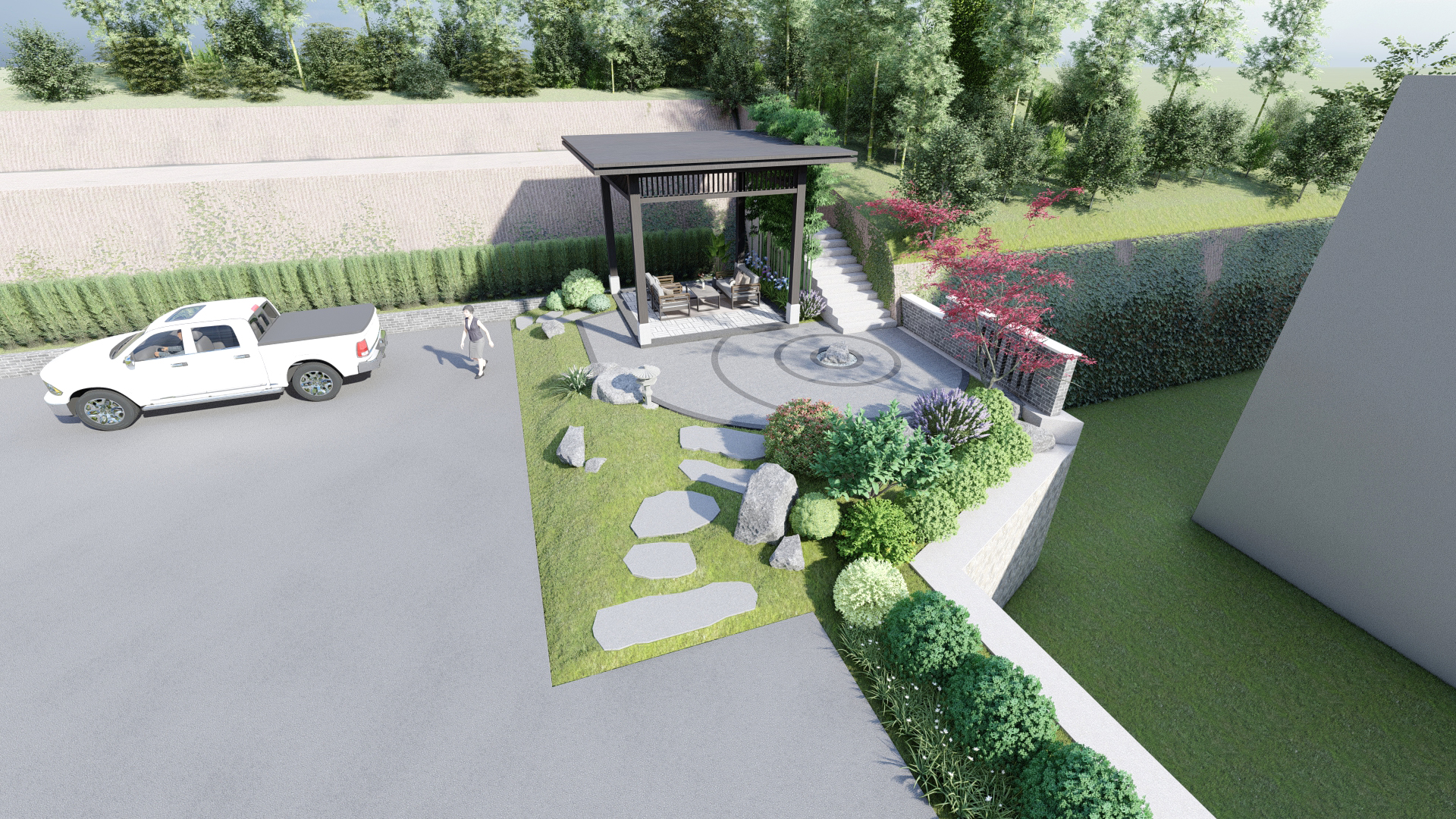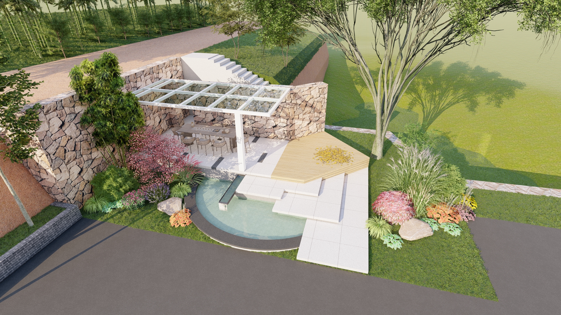 L型高差臺(tái)階增加區(qū)域節(jié)奏感,再搭上一塊可供玩耍的木平臺(tái),角落做一個(gè)休憩涼亭滿足一家人