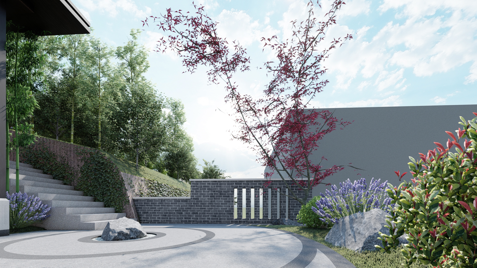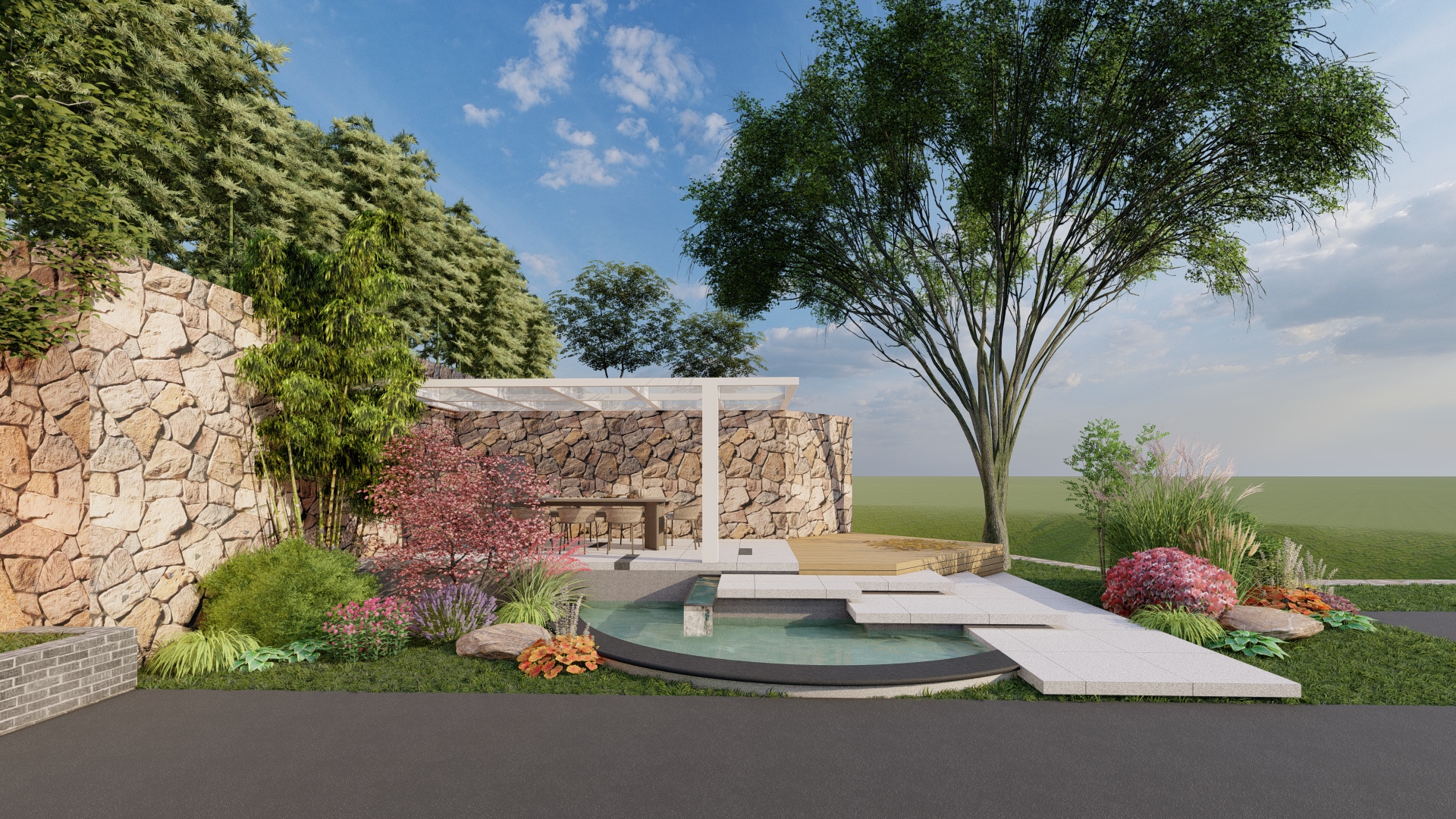 對休閑空間的需求,邊上再搭上圓弧流水景觀聽流水潺潺,像舒適生活,兩側(cè)打造四季小花境,