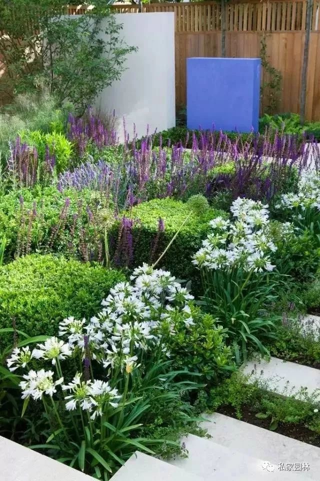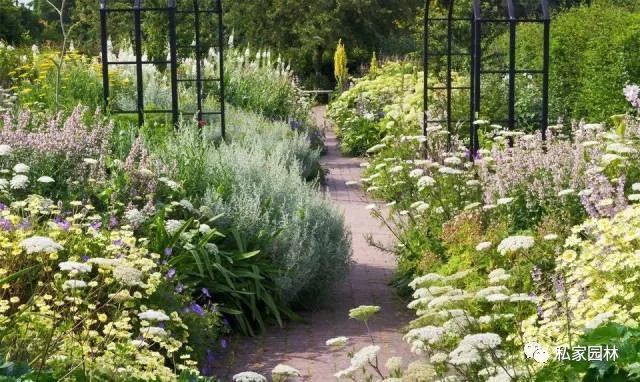 在單色系設(shè)計中其實暗藏小技能,例如營造一個白色花園時,可以取用的白色有很多,奶油白、粉白、青白等,同時在葉色配置方面花點心思,引入對比鮮明的葉色、葉型和質(zhì)感,有助于為花園帶來張力。如葉色可以選擇淺綠、中綠、深綠,也可以使用銀色、灰色或者灰綠色。