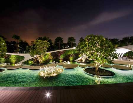CapeRoyale濱海住宅區(qū)不僅可以浪漫的漫步,同時(shí)水池也是這的主要休閑娛樂功能之一。水池不園林僅是裝飾,在無數(shù)的水池中,你可以游泳、散步、享受日光浴在不同大小、形狀、深度的池子之間。有些池子很淺,沒有橋梁,若你想從池子的一邊到另外一邊,只要脫鞋走過去就搞定了,這設(shè)計(jì)影響我們一般行走的習(xí)慣。透過不同的座位安排,能使坐在座位上的每個(gè)人都能一覽無遺的觀看海洋的變化。而低矮的灌木叢將公共路徑分割出來,以良好的距離確保每個(gè)居民的隱私。其他池子是可以游泳的正常大小及深度,在岸上也有可以進(jìn)行日光浴的平臺(tái),所以若您不喜歡游泳,可隨時(shí)享受日光浴。淺水區(qū)游泳池旁享受日光浴的完美空間。照片中游泳區(qū)的椅子事實(shí)上是在水上面的。盡管新加坡讓我們看到原始與特殊的景觀特色,但很容易可以發(fā)現(xiàn),當(dāng)涉及到景觀設(shè)計(jì),這國(guó)家絕對(duì)不是“尋常”、“普通”的。我們可以說,新加坡的景觀在世界上算是數(shù)一數(shù)二的,而CapeRoyale濱海住宅區(qū)可以說絕對(duì)是其中之一。為了降低新加坡的炎熱,并創(chuàng)造花園中的微氣候,硬件設(shè)備建筑施工景觀被減少到最少,而綠化空間則最大化。