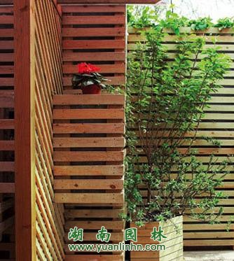 原色木條做成的廊,交叉錯(cuò)落,角落里種植的盆栽,擺放沒有修飾的勢頭,營造了多角度的視覺效果。