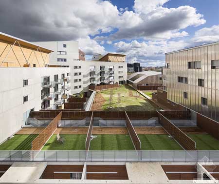 二戰(zhàn)后遺留在此的舊潛艇基地,經過河流的沖刷,從加侖河港口的水平面慢慢升起。設計師要把基地,以及周圍零散的潛艇裝備部件改造成公寓?;?a src='http://m.wh4wh4.cn' title='景杝園林'>垂直綠化海平面高度的限制,設計師將地下停車場轉移到地面中心陽臺花園區(qū)域,并將智慧花園底部兩層連通,二層設開放花園,三個公寓建筑體塊環(huán)繞而設,正立面提供服務設施,空間與街道在視覺上產生對視。